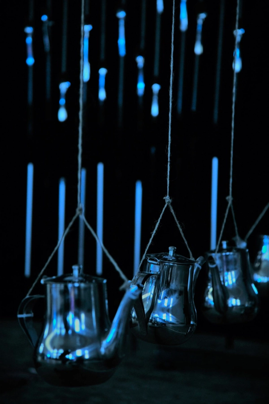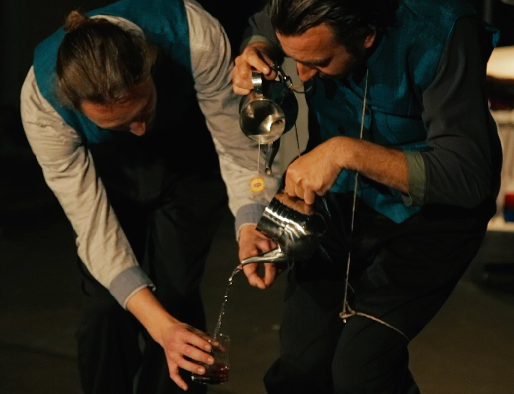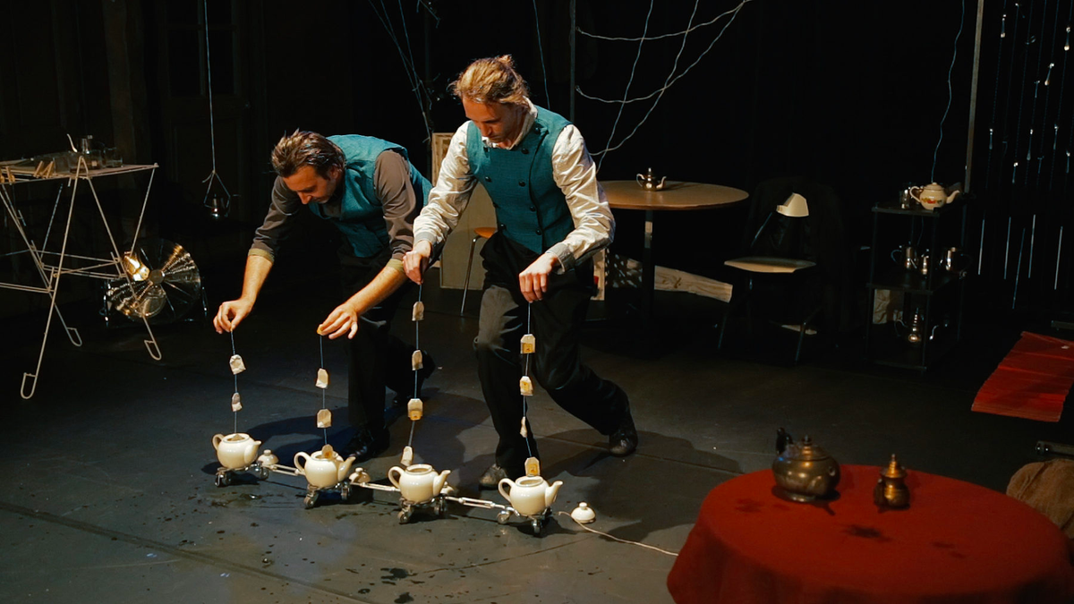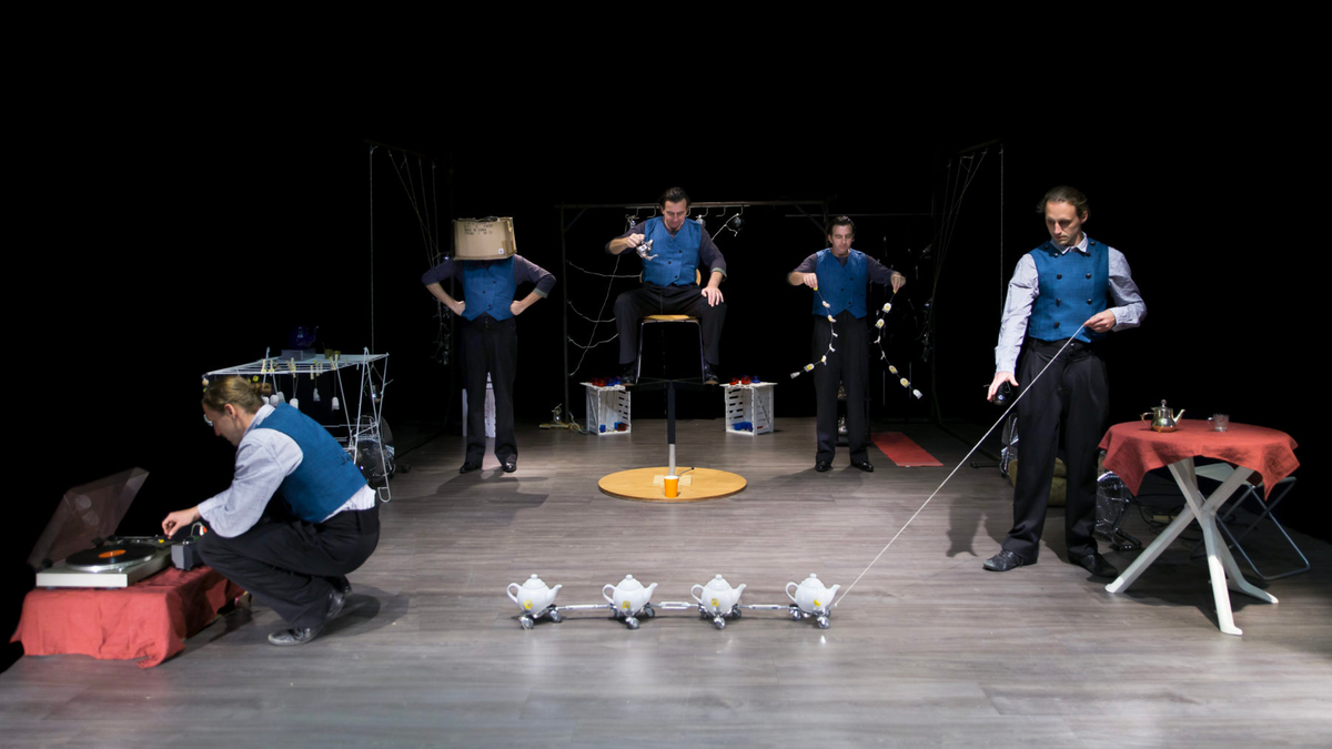 Dans la pure tradition du burlesque et au rythme qu’impose le genre, ils détournent les objets de leurs usages premiers, font voler les théières et danser les verres, mettent les sucres en lévitation dans des chorégraphies mécaniques, font onduler les sachets de Thé comme le joueur de flûte fait lever le serpent…